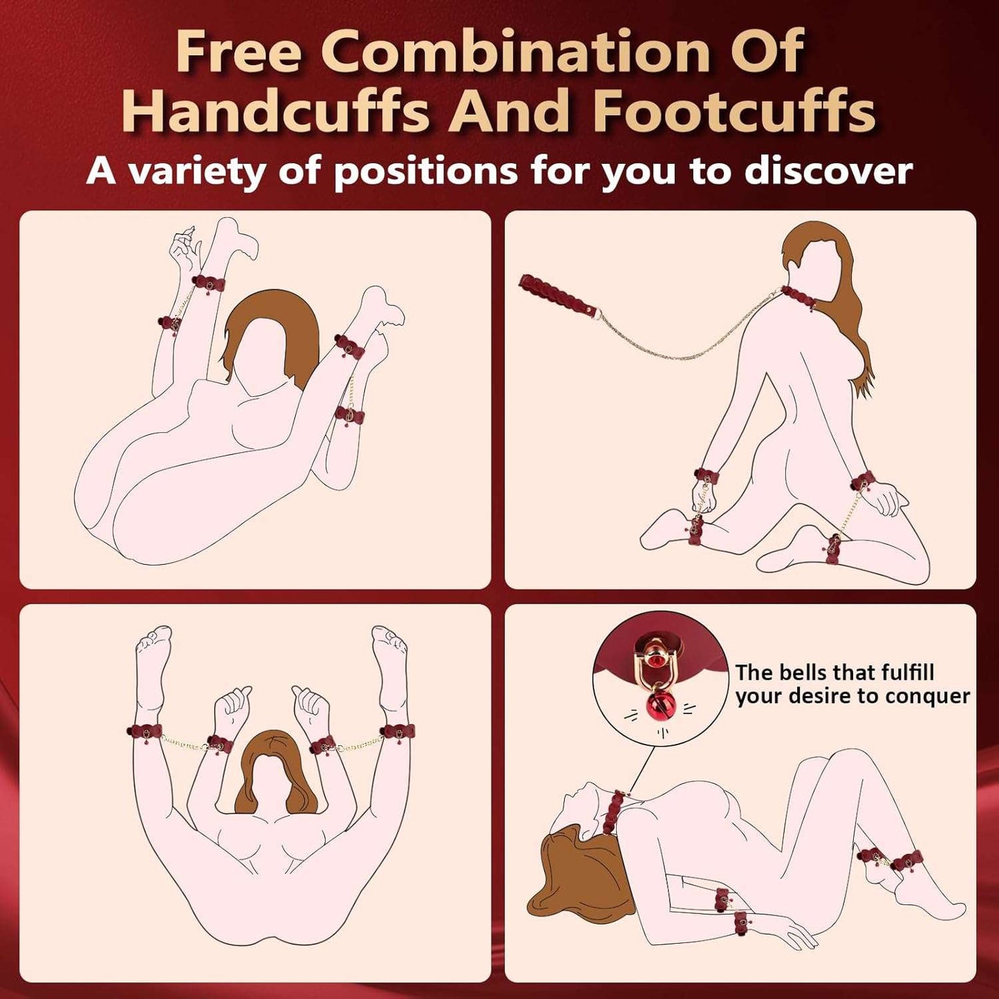 Sensory-Stimulating Bells: Handcuffs, ankle cuffs, and collar include attached bells for subtle sound play—every movement intensifies anticipation.
