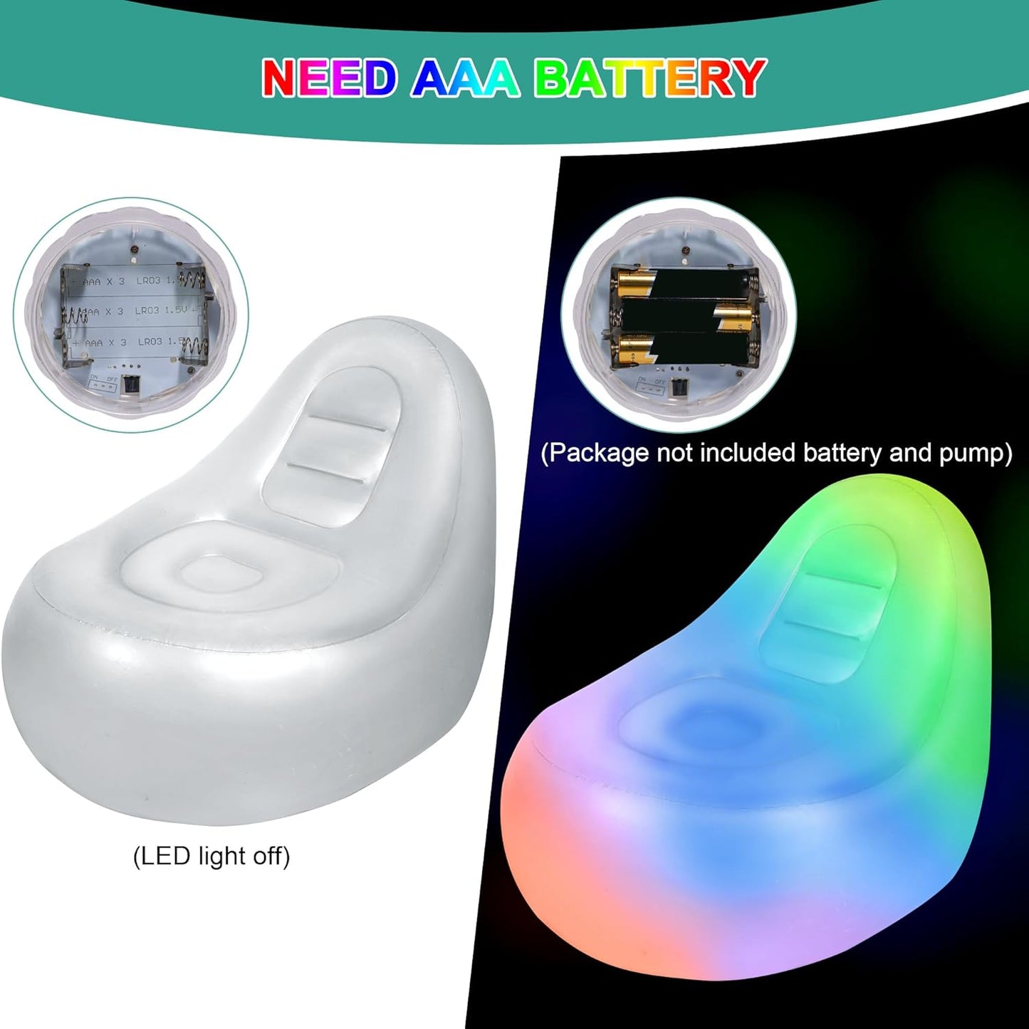 LED Lighting: Color-changing LED with remote control; features constant or pulsating light modes (AAA batteries required, not included).