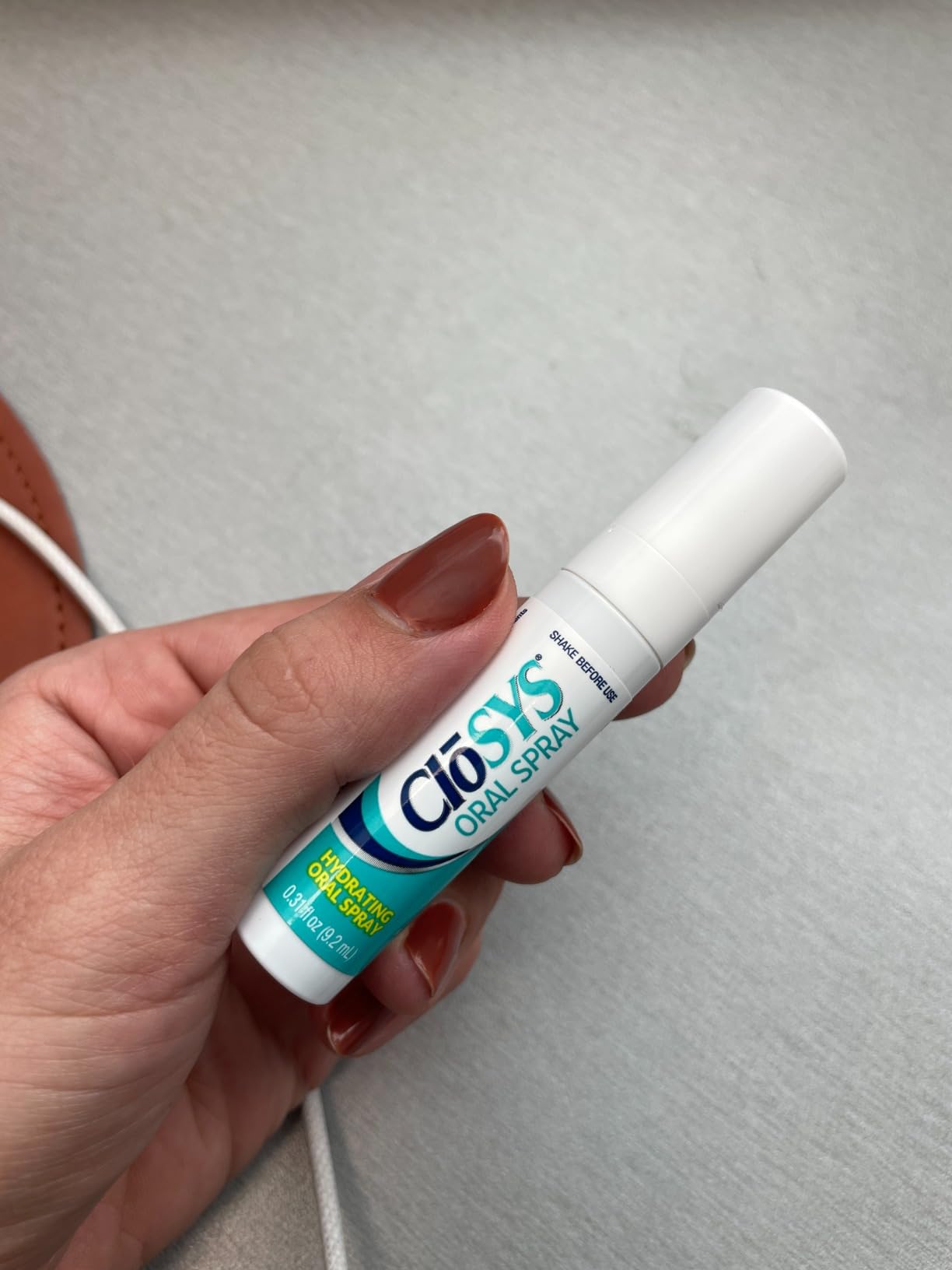 Remove cap and aim nozzle toward your mouth.