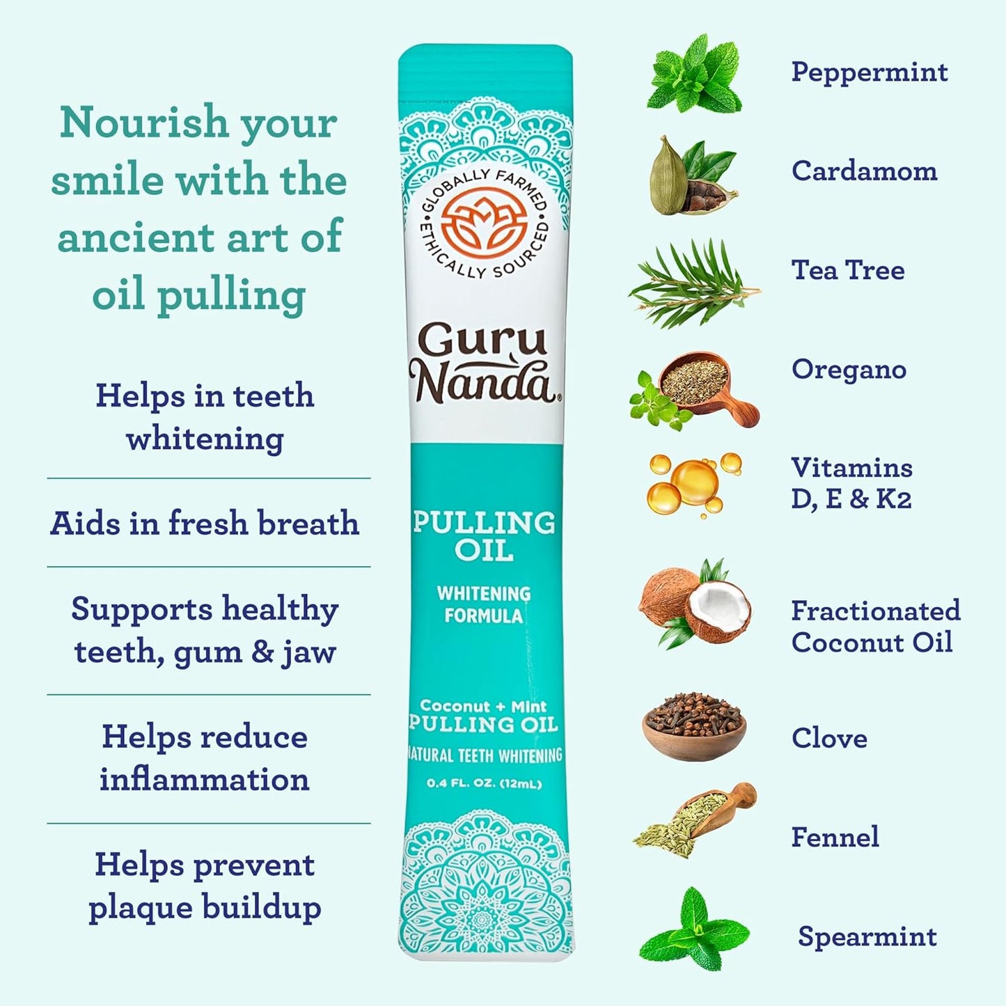 Oil Pull: Tear open the sachet, swish oil in your mouth for 2–5 minutes, then spit out.