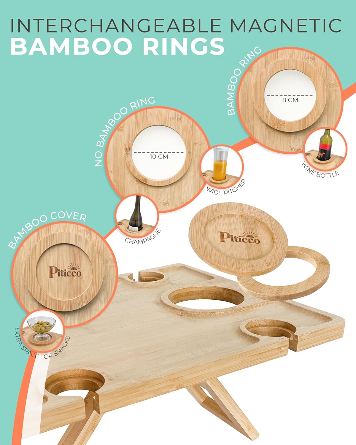 Includes: Interchangeable bottle rings, bamboo hole cover, foldable legs, canvas tote bag, and picnic mat